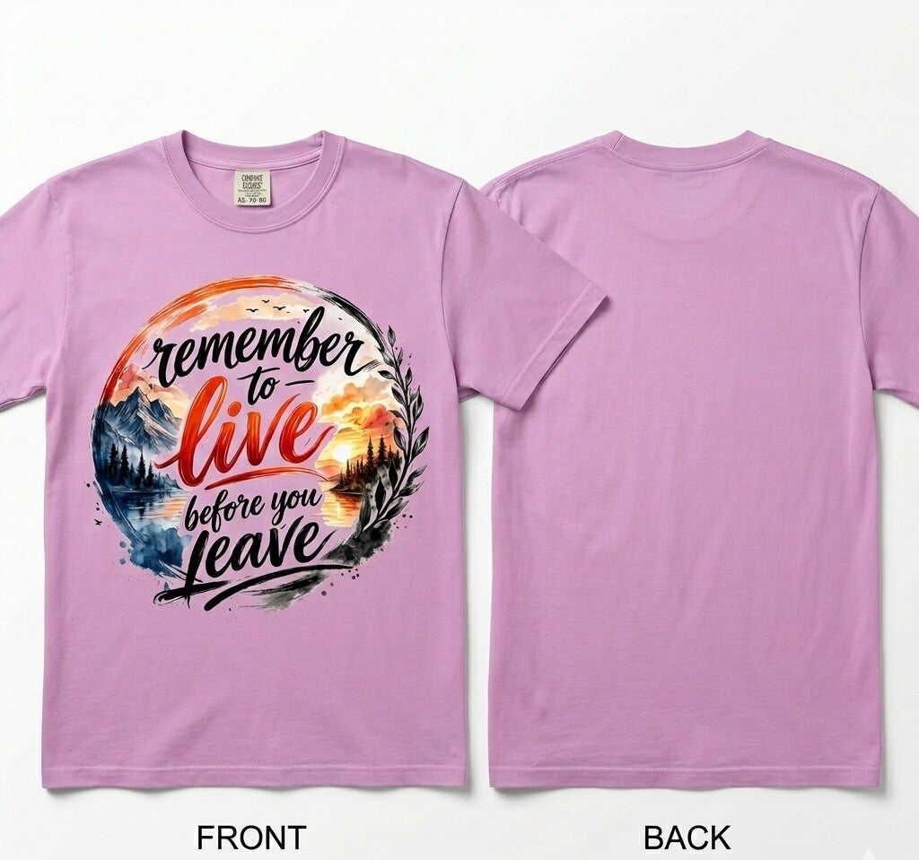 This outfit features a soft pink short-sleeve T-shirt with a relaxed, casual fit, designed for everyday comfort and style. The front showcases a vibrant, artistic graphic of a scenic landscape—mountains, water, and a warm sunset—blended into a circular composition, overlaid with an inspirational quote that reads “Remember to live before you leave” in a mix of bold and script typography. The back of the shirt is plain, keeping the focus on the expressive front design. Overall, it’s a laid-back yet meaningful piece that combines cozy wearability with a motivational, outdoors-inspired aesthetic.